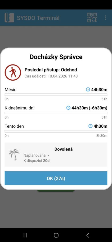 Po spárování se do terminálu nahraje nastavení (typy přístupů a uživatelé). Tato operace může trvat několik minut, doporučujeme restartovat aplikaci, případně celé zařízení.