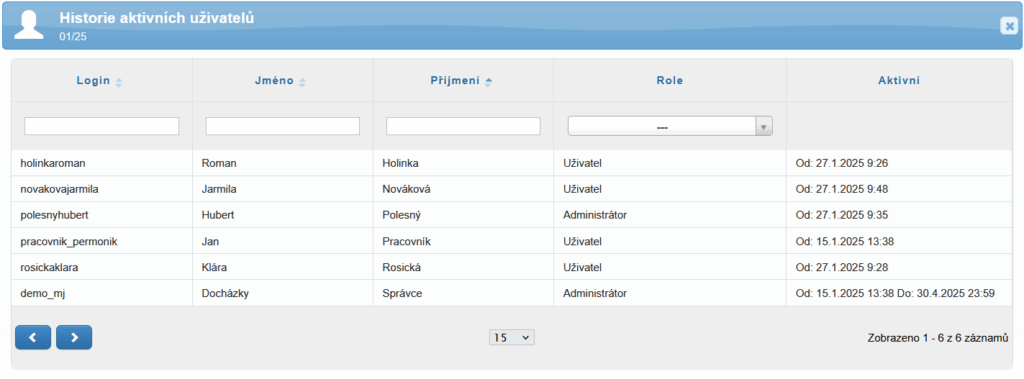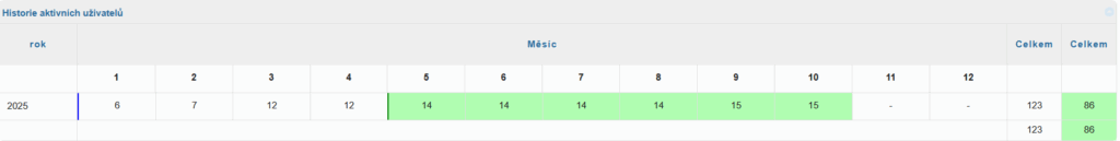 V dolní části přehledu se nachází sekce Historie aktivních položek (uživatelů, dveří, vozidel, kamer, alkohol testerů nebo pochůzkových bodů). Tato tabulka zobrazuje počet aktivních položek vybraného modulu za jednotlivé měsíce daného roku.