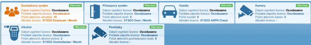 počet aktivních položek (uživatelů, dveří, vozidel, kamer, alkohol testerů nebo pochůzkových bodů),