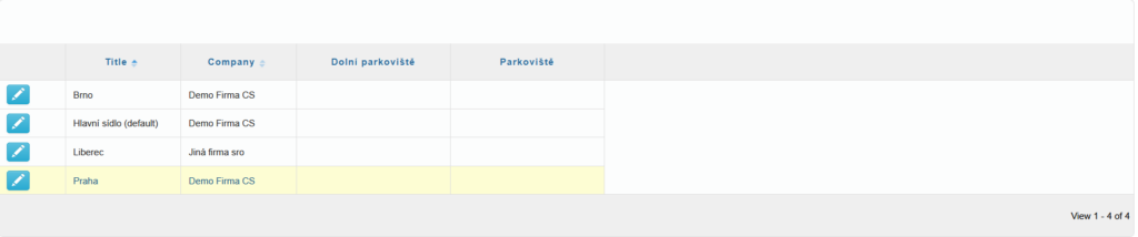 15.10.202522.12.2025 monca Admin Branches – number of parking spaces The overview table, where individual entries can also be edited , displays the branch title, company name, and the configured areas|parking areas.