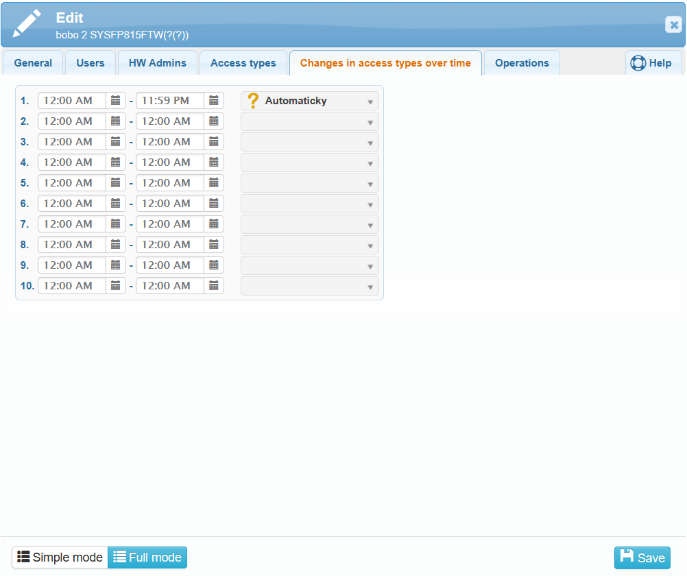 “Automatic Time Mode Change” – selection of the time period for each access type.
