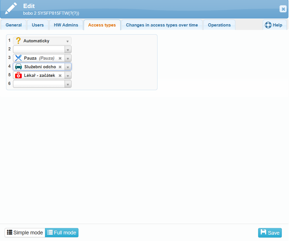 “Time Mode Type” – sets the descriptions of available access types (arrival, departure, doctor visit, etc.).