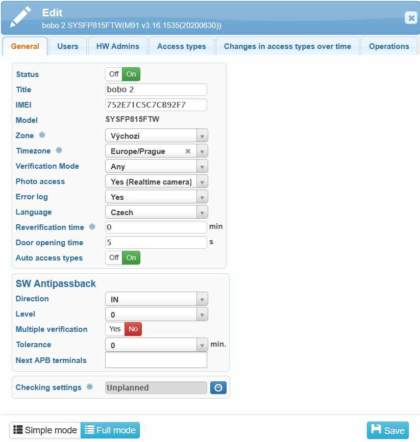 “Verification Mode” – selection of the user verification method. You can choose three basic methods: face, fingerprint, card and password individually, or any combination of them including password. “Any” allows verification by face OR fingerprint OR card.