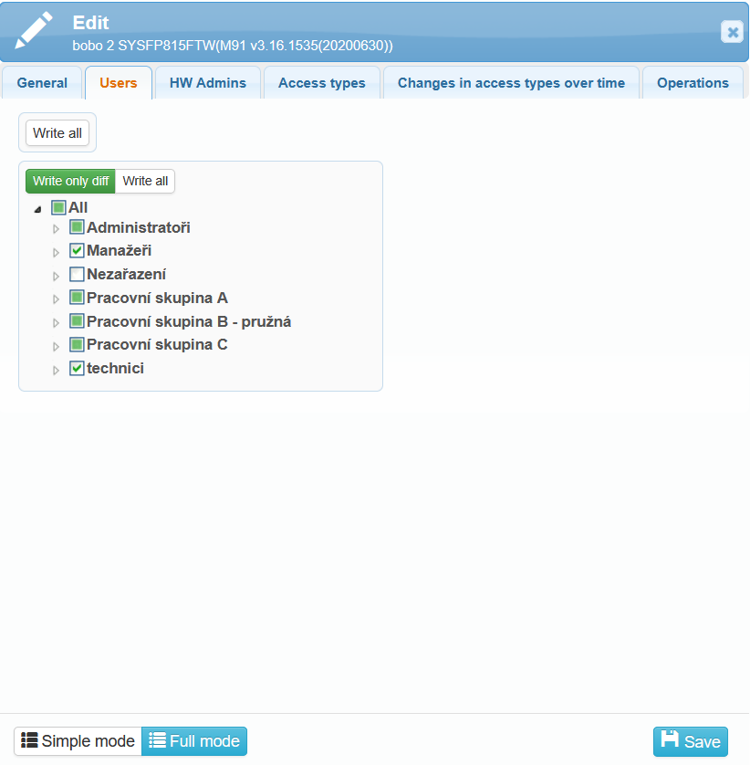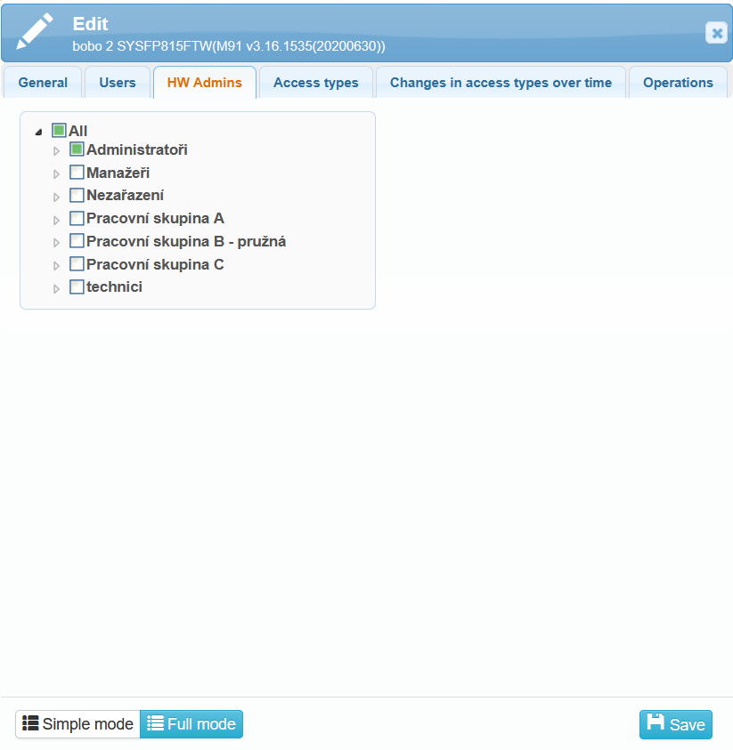 In the HW Admin tab, you can select users who have permission to manage and configure the selected reader. If at least one user with administrator permissions is loaded in the system, access to the main menu requires administrator verification. If the login password is unknown or no other administrator authentication method is possible, you can reset the administrator permissions directly on the reader.