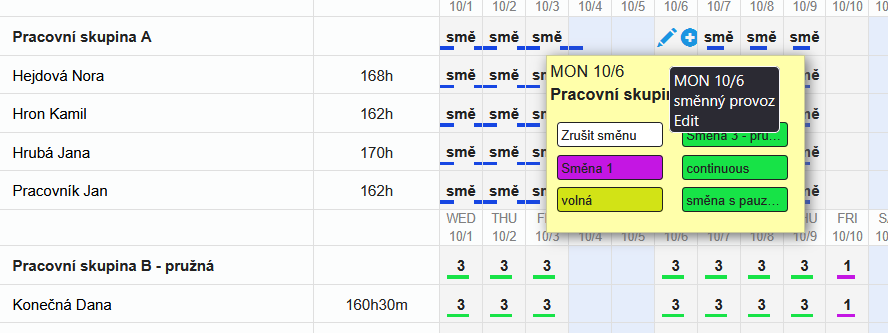 Tooltip menu for shift planner