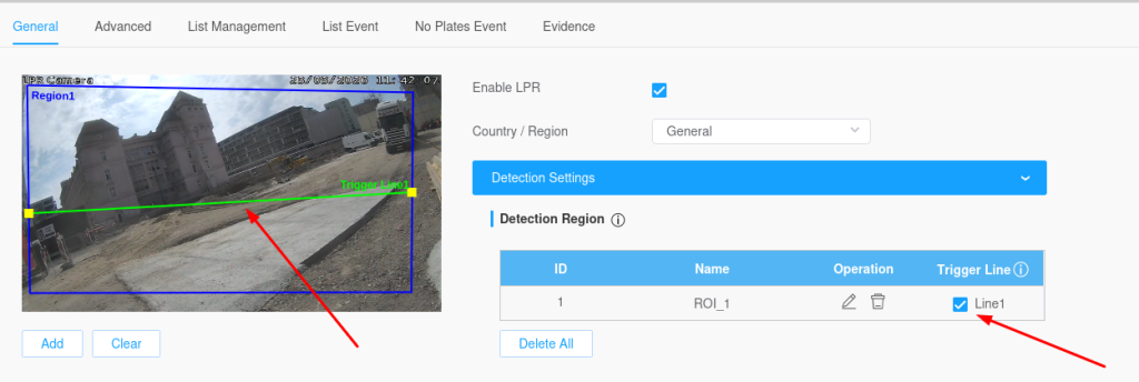 Pro správnou funkci je nutné nejprve nastavit detekční oblast (Detection Region), ve které se vozidla sledují. Následně se do této oblasti umístí spouštěcí čára tak, aby vozidlo projelo ideálním místem pro čtení SPZ.