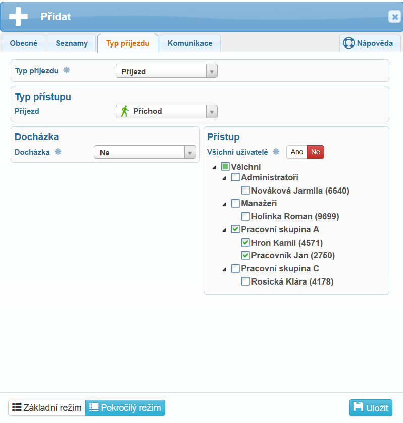 Zvolte možnost Ano a vyberte uživatele v seznamu Docházka.