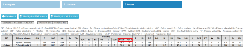 V Reportech docházky – Měsíční souhrn je možné zobrazit pohotovosti v pracovních i nepracovních dnech.