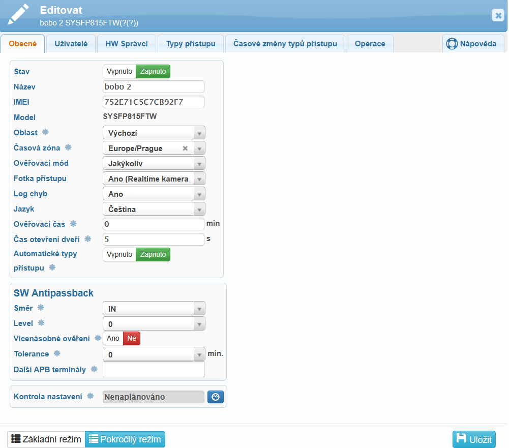 - v administrátorském rozhraní ve čtečce (ikonka domečku na obrazovce čtečky v levém dolním rohu) se zobrazuje v Nastavení - Komunikace - Nastavení P2P - unikátní ID zařízení = (IMEI)