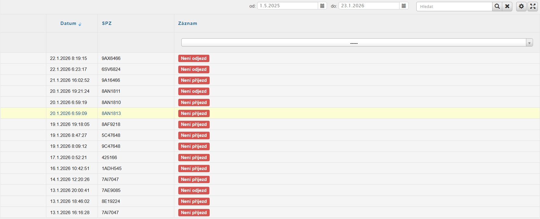 Tím je zajištěna snadná orientace v chybových událostech a efektivní správa docházky. V přehledové tabulce se následně zobrazuje datum chyby, spz vozidla a typ záznamu (chyby).