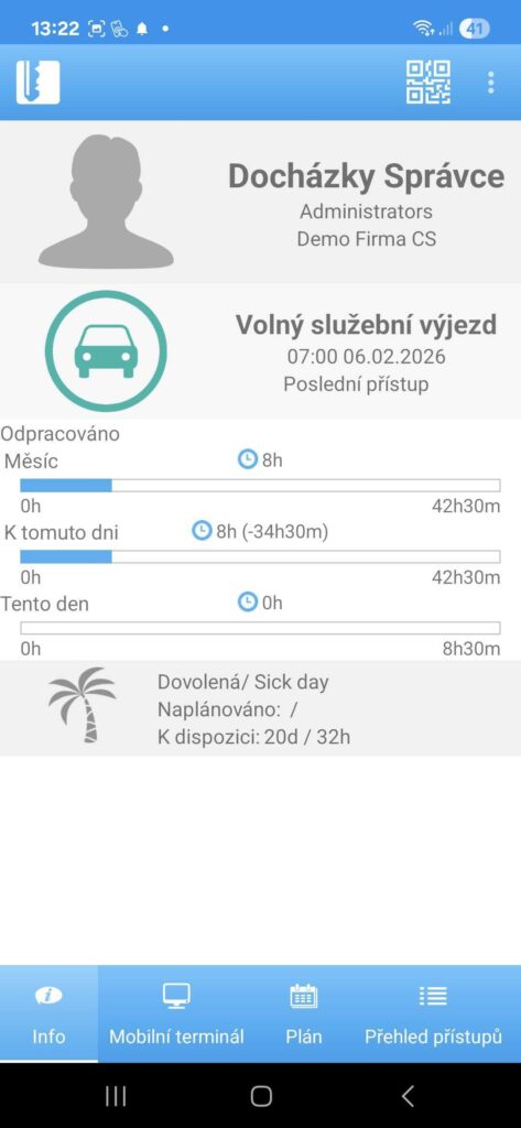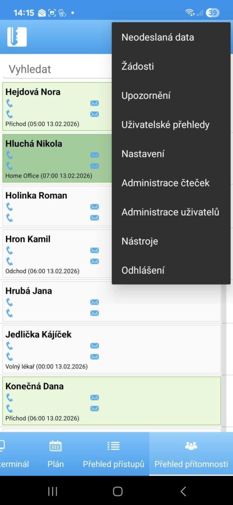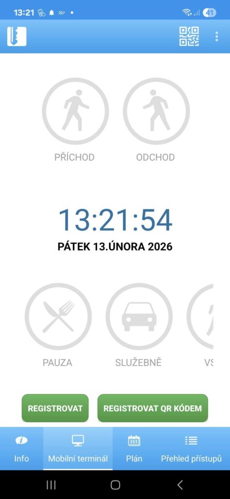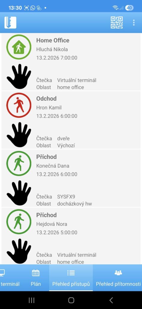 Systém dokáže inteligentně rozpoznat typ přístupu podle nastavené pracovní směny (automatický typ přístupu). V případě, že jste vedeni jako nepřítomni, je přístup u čtečky určen jako příchod. Když odcházíte v době, kdy je ve směně nastavena pauza, je přístup rozeznán jako pauza. Pokud máte schválenou žádost k návštěvě lékaře, systém při odchodu určí přístup jako odchod k lékaři. Automatické rozpoznání typů přístupu platí pouze pro přístupy s funkcí Vstup, Výstup, Pauza a K lékaři. Ostatní typy přístupů je potřeba zadávat vybráním události na čtečce.